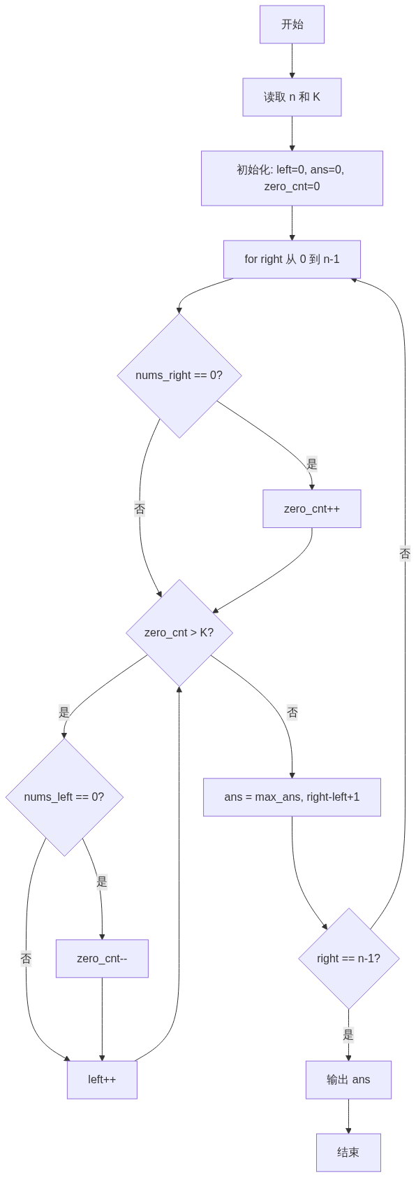 cnt0 > K,说明现在的窗口“透支”了翻转次数。 left开始向右缩,如果缩掉的是 0,cnt0就减 1,直到cnt0 <= K为止。- 过程中,