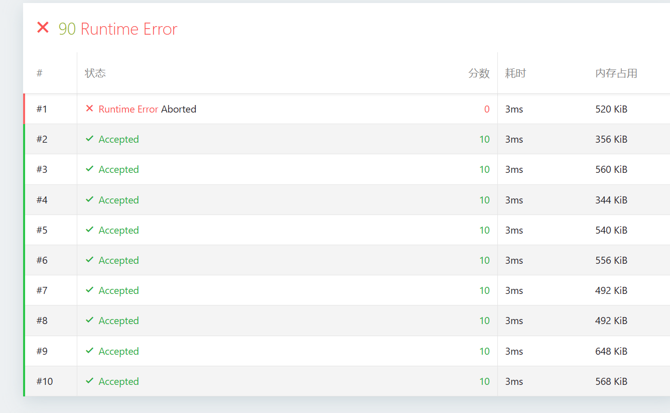 • Runtime Error (RE):通常是溢出、除以零、或者未捕获的异常