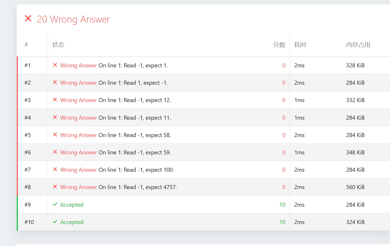 - #1 (N=1): 读到 -1,期望 1。说明程序对 特判失败。