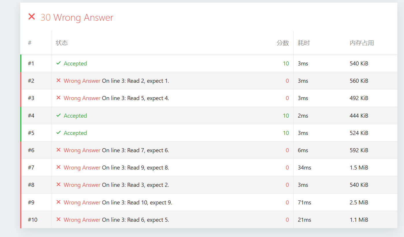 Read 2, expect 1,正是因为你的程序在第三行输出了2 3(以 2 开头),而标准答案期望输出1 4(以 1 开头)。