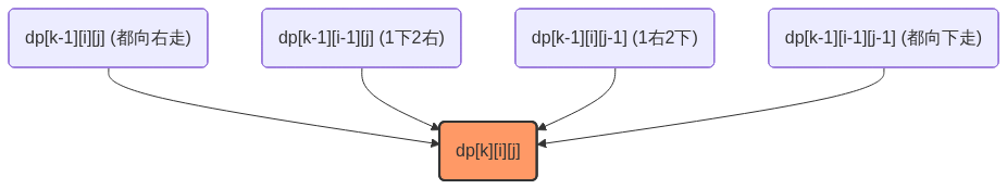 graph TD A("dp[k-1][i][j] (都向右走)") --> E("dp[k][i][j]") B("dp[k-1][i-1][j] (1下2右)") --> E C("dp[k-1][i][j-1] (1右2下)") --> E D("dp[k-1][i-1][j-1] (都向下走)") --> E style E fill:#f96,stroke:#333,stroke-width:2px逻辑判断点: