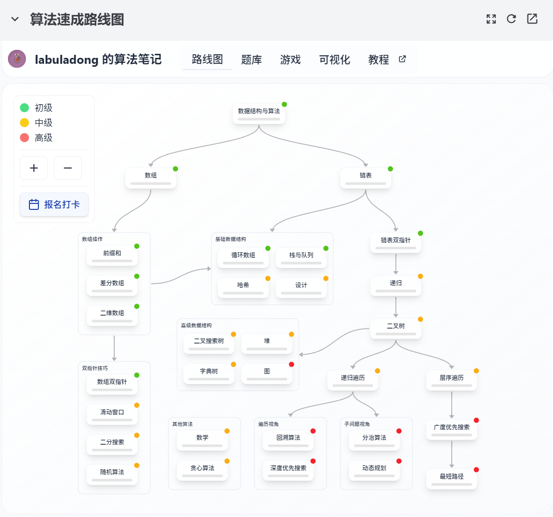 (注意labuladong这个网站的学习路线偏工作面试用的数据结构底层原理,优点是把数据结构的底层原理讲的比较举一反三,缺点是原网页用的是java语言代码较为繁琐 因为OI比赛更侧重理解题意和DP等算法思维的深度灵活运用,不单独考察基础数据结构等纯知识点理解,数据结构主要是结合在算法中用于把时间复杂度优化到极致)